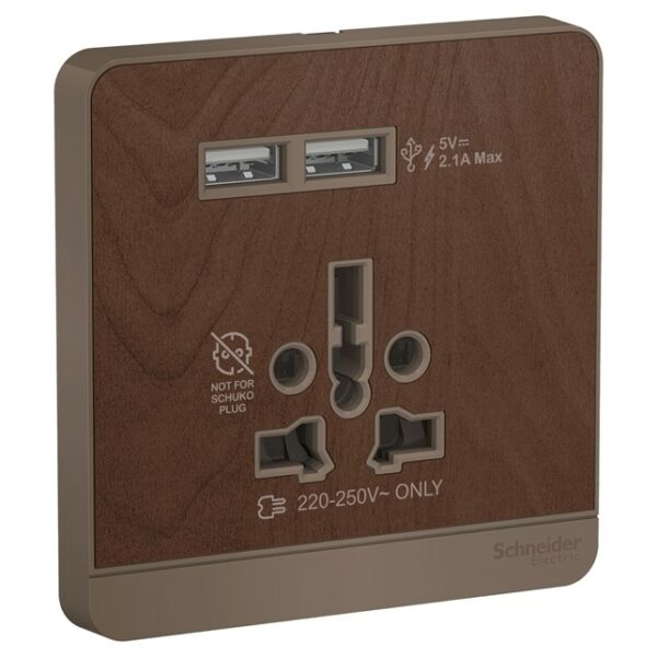Stop Kontak Schneider AvatarOn, USB charger + 2 socket-outlet, 2P, 16A, Wood
