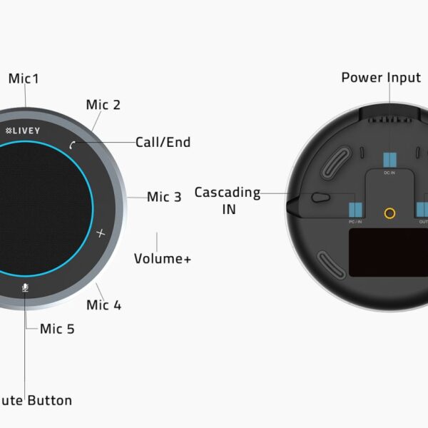 Deskripsi : A professional conference speakerphone from LIVEY, designed for medium to large meeting rooms. It features 8-directional MEMS microphone