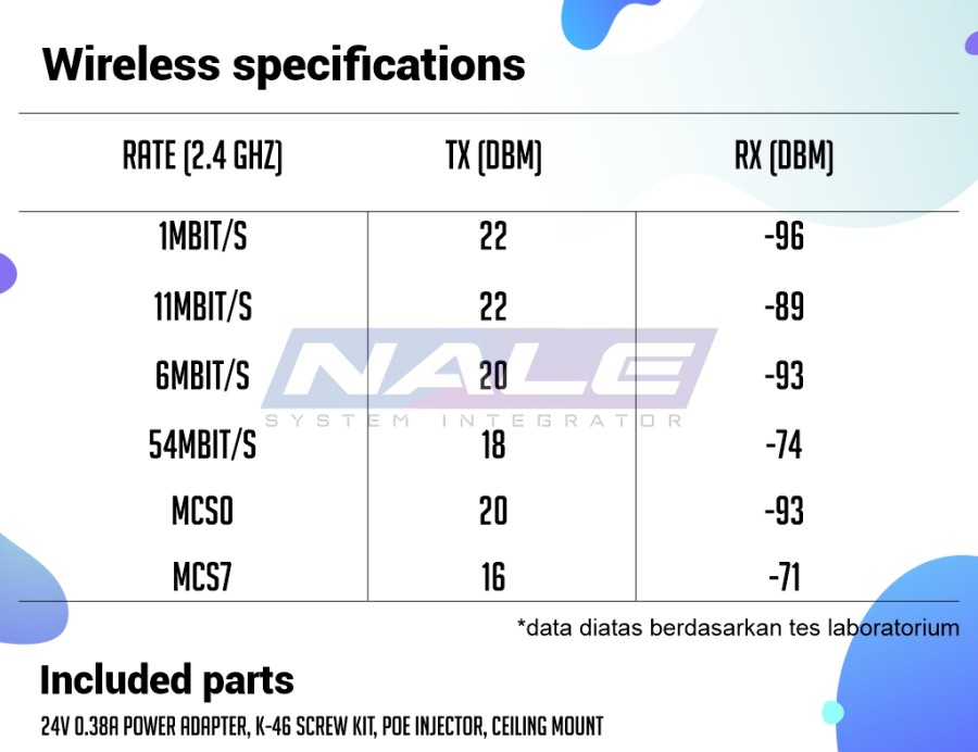 Sudah termasuk 24V 0.38A power adapter, K-46 screw kit, PoE injector, Ceiling mount