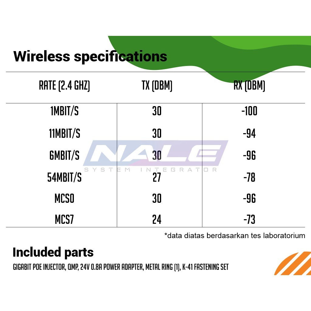 *sudah termasuk Gigabit PoE injector, QMP, 24V 0.8A power adapter, Metal ring (1), K-41 fastening set
