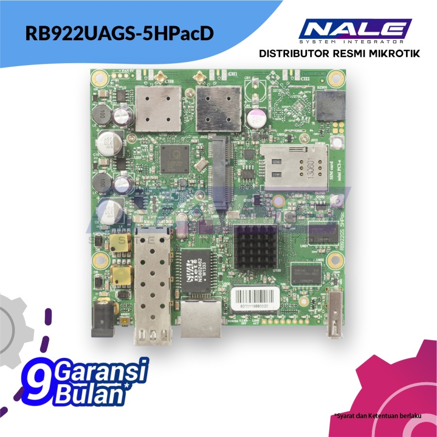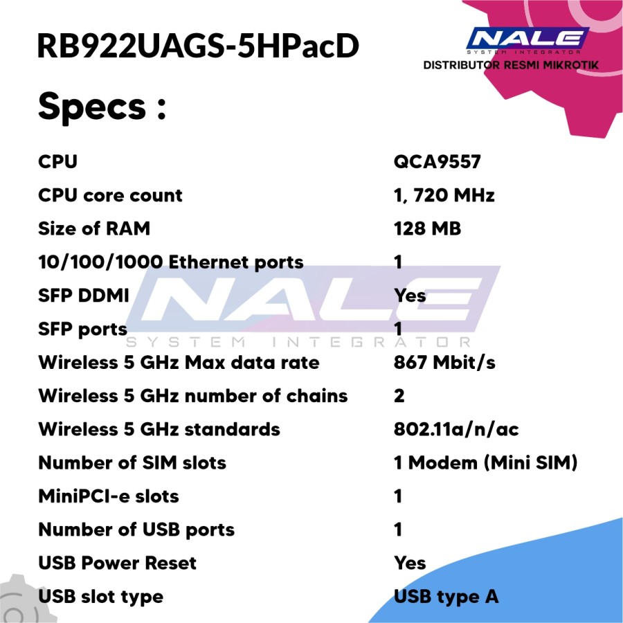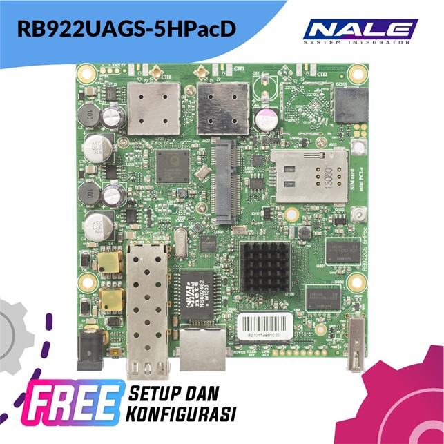 RouterBOARD RB922UAGS-5HPacD adalah router nirkabel yang sangat serbaguna, cocok untuk merakit solusi Anda sendiri. Ini mendukung standar baru 802.11ac untuk nirkabel kecepatan tinggi (hingga 866Mbit datarate dan saluran 20/40 / 80MHz). Perangkat ini memiliki port dan slot untuk banyak kegunaan: 1x sangkar SFP, slot miniPCIe dengan SIM untuk modem 3G / 4G atau kartu nirkabel lain, port USB, port Gigabit Ethernet dan dua konektor MMCX untuk built in radio 802.11ac 2×2 yang kuat. Dilengkapi dengan lisensi RouterOS L4 (AP).