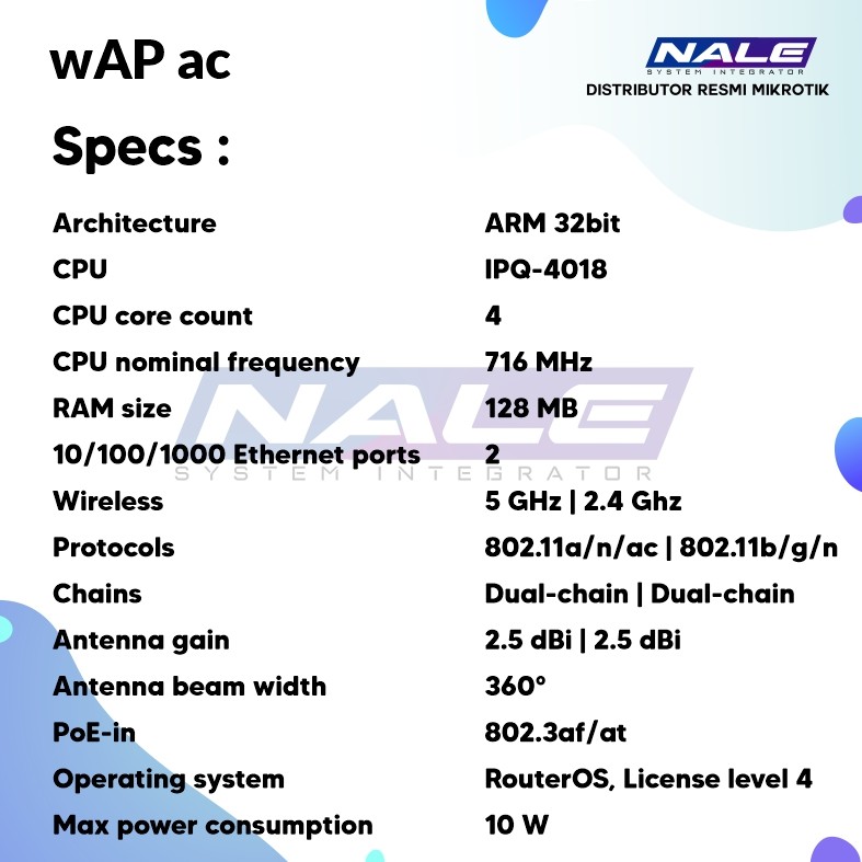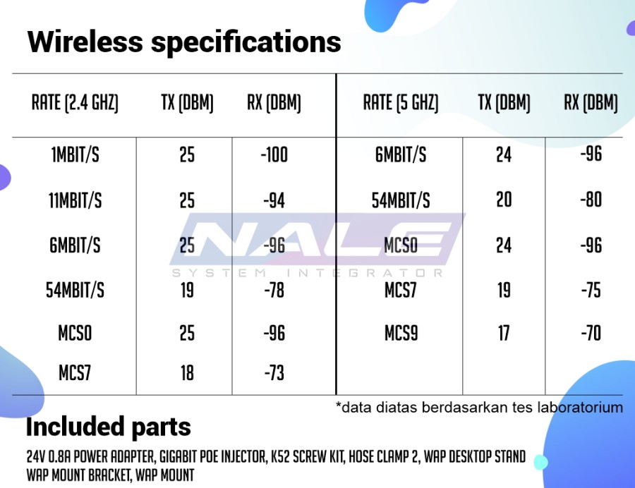 Sudah termasuk 24V 0.8A power adapter, Gigabit PoE injector, K52 screw kit, Hose clamp 2, wAP desktop stand, wAP mount bracket, wAP mount